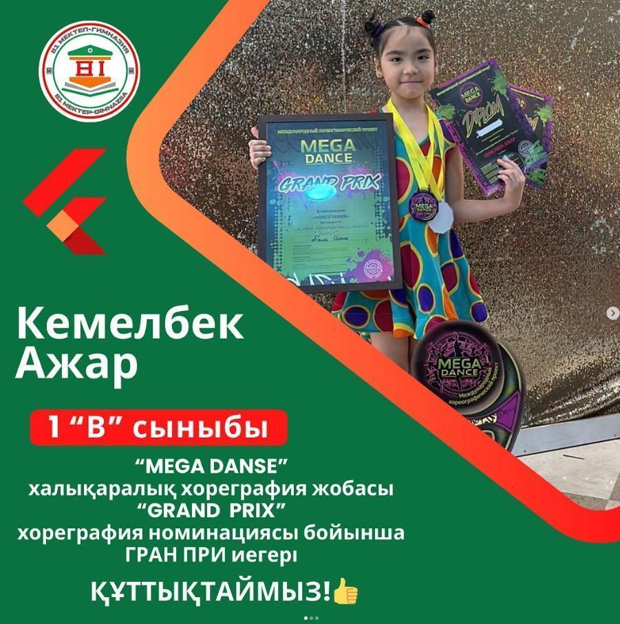 “MEGA DANSE” халықаралық хореграфия жобасы “GRAND PRIX” хореграфия номинациясы бойынша 1 “В” сынып оқушысы Кемелбек Ажар