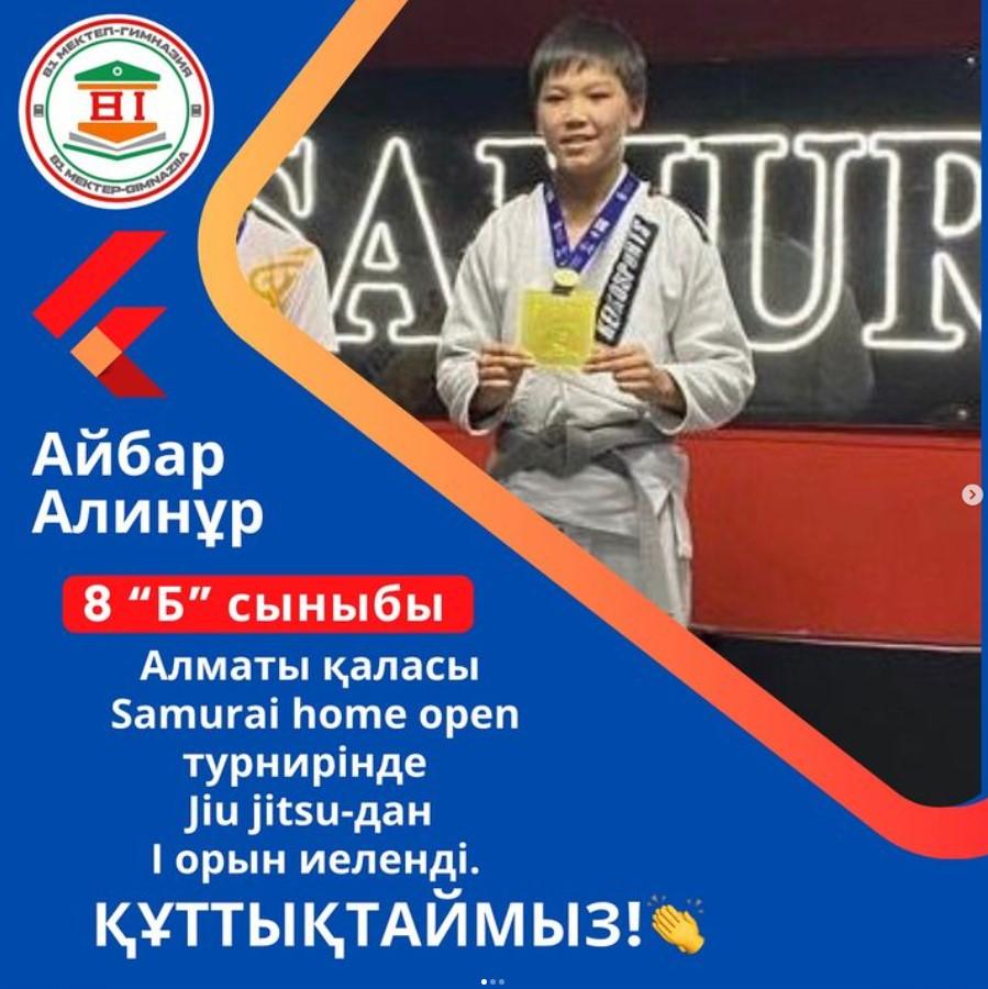Алматы қаласы Samurai home open турнирінде Jiu jitsu-дан 8 “Б” сынып оқушысы Айбар Алинұр І орын иеленді. Жарайсың, құттықтаймыз!👍🇰🇿👏 https://www.instagram.com/p/DBtNvpbOLt4/?utm_source=ig_web_copy_link&igsh=MzRlODBiNWFlZA==