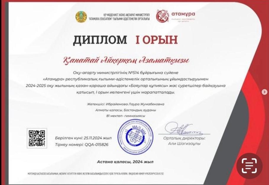 Оқу-ағарту министрлігінің No514 бұйрығына сүйене «Атамұра» республикалық ғылыми-әдістемелік орталығының ұйымдастыруымен 2024-2025 оқу жылының қазан-қараша айындағы «Бояулар құпиясы» жас суретшілер байқауына 1 “Ә” сынып оқушылары қатысып, жүлделі орындарға ие болды.