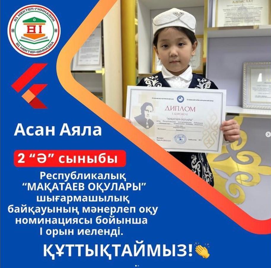 Республикалық “МАҚАТАЕВ ОҚУЛАРЫ” шығармашылық байқауының мәнерлеп оқу номинациясы бойынша 2 “Ә” сынып оқушысы Асан Аяла І орын иеленді.