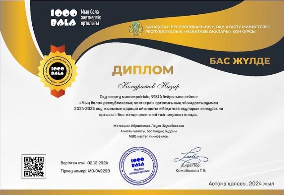 Оқу-ағарту министрлігінің No514 бұйрығына сүйене «Мың бала» республикалық зияткерлік орталығының ұйымдастыруымен 2024-2025 оқу жылының қараша айындағы «Мақатаев оқулары» конкурсына қатысып, 1 “Ә” сынып оқушысы Кондратов Назар жүлделі орынға ие болды.