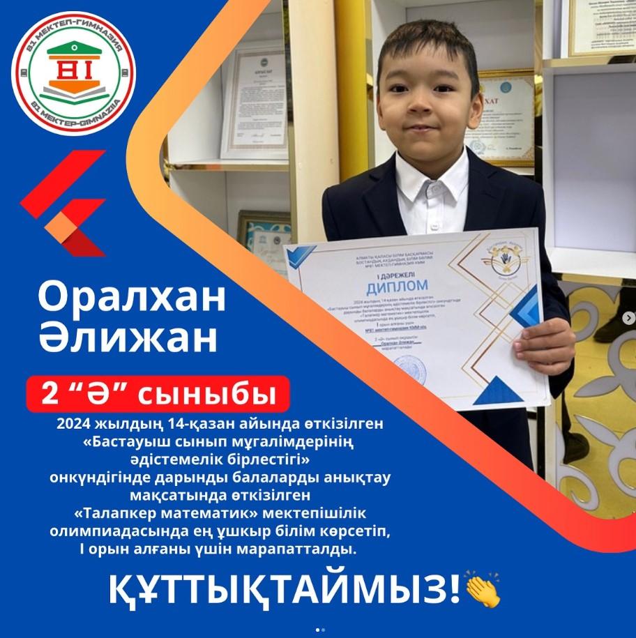 мақсатында өткізілген «Талапкер математик» мектепішілік олимпиадасында ең ұшкыр білім көрсетіп, І орын алғаны үшін 2 “Ә” сынып оқушысы Оралхан Әлижан марапатталды.