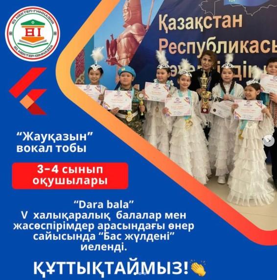 “Dara bala” V халықаралық балалар мен жасөспірімдер арасындағы өнер сайысында мектебіміздің “Жауқазын” тобы бас жүлде иеленді.