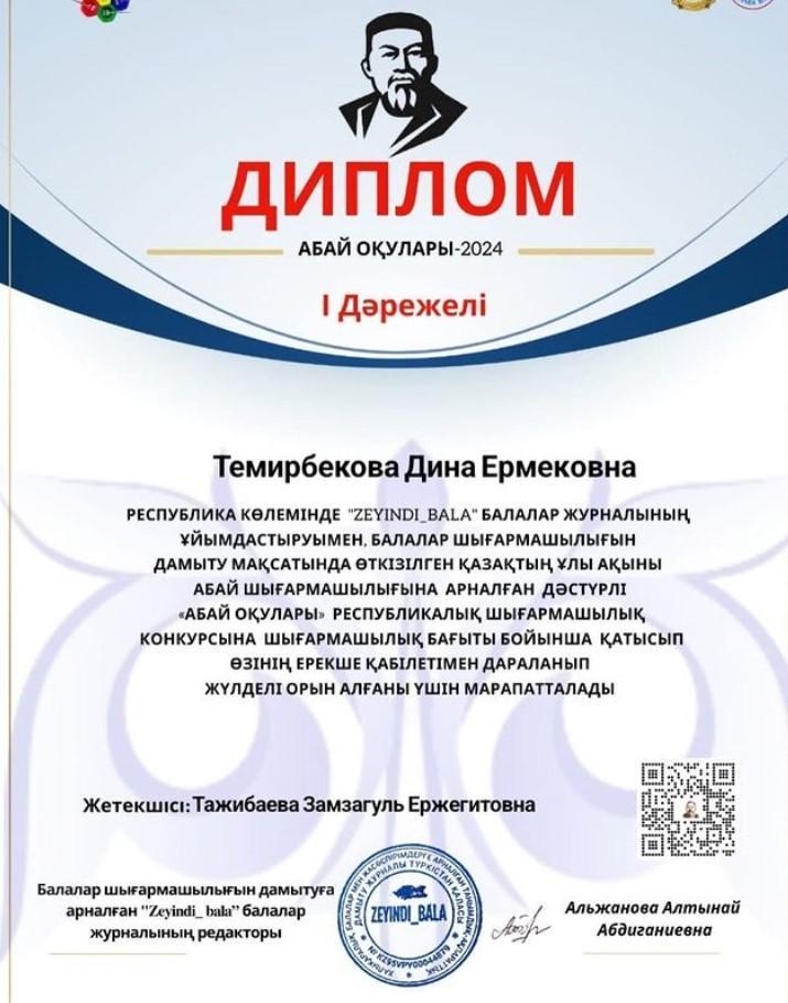 Темирбекова Дина Ермековна РЕСПУБЛИКА КӨЛЕМІНДЕ “ZEYINDI_BALA” БАЛАЛАР ЖУРНАЛЫНЫҢ ҰЙЫМДАСТЫРУЫМЕН, БАЛАЛАР ШЫҒАРМАШЫЛЫҒЫН ДАМЫТУ МАҚСАТЫНДА ӨТКІЗІЛГЕН ҚАЗАКТЫҢ ҰЛЫ АҚЫНЫ АБАЙ ШЫҒАРМАШЫЛЫҒЫНА АРНАЛҒАН ДӘСТҮРЛІ