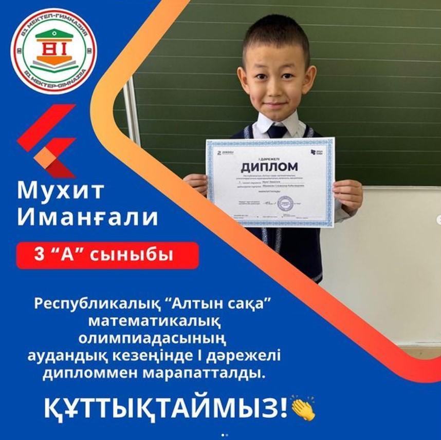 “Алтын сақа” математикалық олимпиадасының аудандық кезеңінде 3 “А” сынып оқушысы Мұхит Иманғали І дәрежелі дипломмен марапатталды.