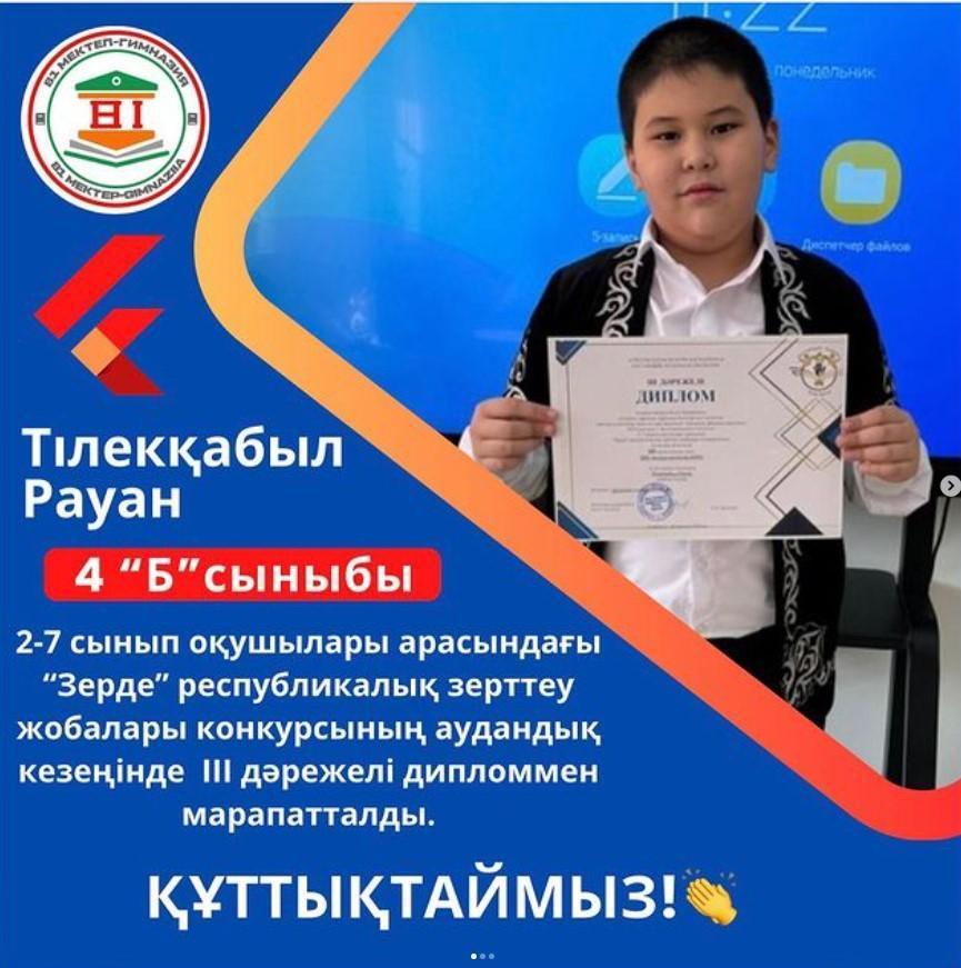 2-7 сынып оқушылары арасындағы “Зерде” республикалық зерттеу жобалары конкурсының аудандық кезеңінде 4 “Б” сынып оқушысы Тілекқабыл Рауан ІІІ дәрежелі дипломмен марапатталды.